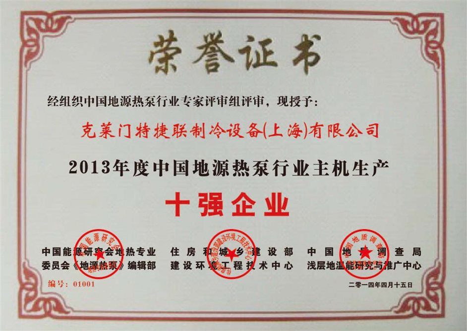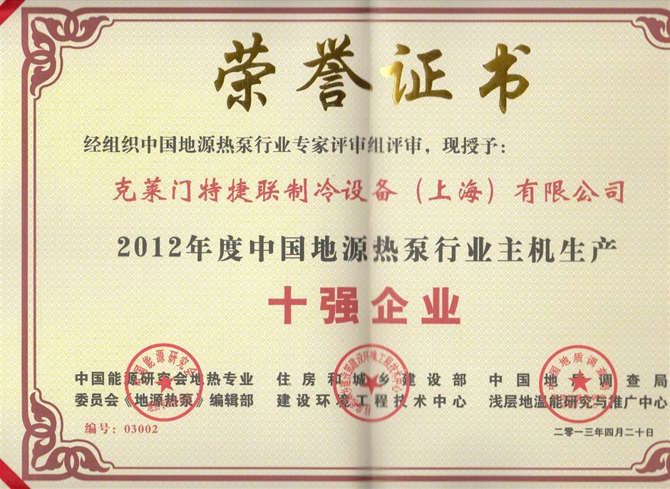 連續(xù)多年獲得“ 年度中國地源熱泵行業(yè)主機(jī)生產(chǎn)十強(qiáng)企業(yè) ”獎項